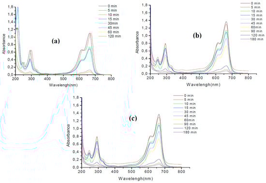 Spectra of MB biosorpion assisted by AC using (a) hybrid material L.C + 4% Zn2+ synthesized in presence of AC, (b) hybrid material L.C + 4% Zn2+ synthesized in absence of AC and (c) pure L.C, Ci = 10 mg/L, pH = 10, mL.C = 0.1g, V = 0.1 L, T = 298 K.