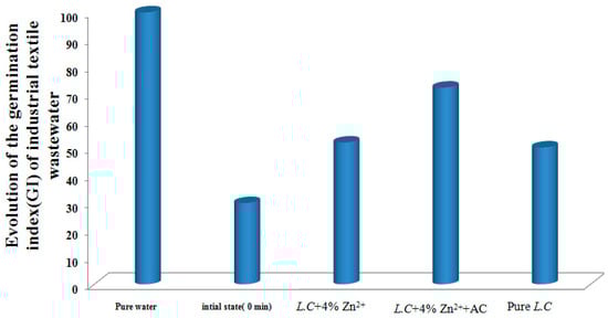 Figure 6 (Figure S1 in the complementary information) presents the main results obtained. The germination index (GI) of the initial concentrations of the tested industrial wastewater was equal to 29.87%. After biosorption assisted by AC, the percentage of the germination index increased indicating a decrease in the toxicity of the wastewater tested. It reached respectively 72.33, 59.79, and 52.14%, respectively, when using the hybrid material (L.C + 4% Zn2+) synthesized in presence of AC, the hybrid material L.C + 4% Zn2+ synthesized in presence of AC and the pure L.C. Results showed that all GI were higher than 50%, indicating the purity of the treated wastewater and its suitability to agricultural use.
