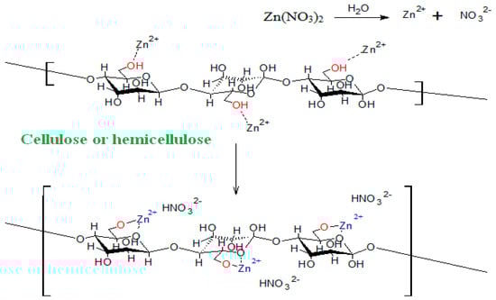 An assumption of the pathway of the fixation of Zn2+ ions onto the L.C fibers and the possible interactions between MB and the synthesized hybrid material were predicted as shown in Figure 7 and Figure 8.