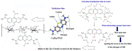 When alternating current intervenes, the molecules of H2O enter into agitation opening the access to the free links of the nitrogen of MB which subsequently binds to the Zn-O bond created on the biomass.