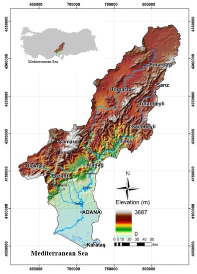 The Seyhan River Basin is located in the southern part of Turkey (Figure 1). The climate in the Seyhan River basin is strongly influenced by the topography. The northern part of the basin is characterized by a mountainous, steep, harsh topography while lowlands prevail in the southern part of the basin (Figure 1). The basin extends from the Mediterranean coast to the Central Anatolia and shows three different characteristics in terms of climate. The northern part of the basin exhibits the characteristics of the Central Anatolian climate; thus, it is colder than the southern part of the basin; the highest precipitation is observed at highlands in this part of the basin. In the coastal areas of the Çukurova plain and the surrounding areas, the summer season is hot and dry while the winter is warm and rainy. That part of the basin between the coastal zone in the south and the Tarsus mountains in the north has a semi-arid Mediterranean climate with dry and hot summers and rainy and warm winters.