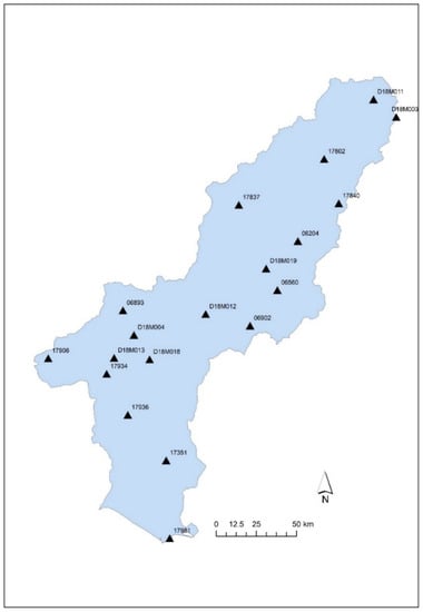 Monthly precipitation data were obtained from 19 meteorological stations operated by the State Meteorological Service (MGM with its Turkish acronym) and from the General Directorate of State Hydraulic Works (DSI). The meteorological stations are listed in Table 1 in which the number and name of the stations are given together with the observation period of each station and the total number of missing data filled (in months). Statistical characteristics calculated from the monthly precipitation time series of each meteorological station are also given in Table 1. They are the minimum, maximum and mean values of monthly precipitation data in each meteorological station. It is seen, for example, that station 17981 (Karataş) among all meteorological stations has the highest percentage of no-rainy months (15.31%) and also the lowest altitude (22 m above mean sea level) compared to other stations. The altitude of the meteorological stations varies greatly within the basin owing to the topography. Data quality is an important issue in meteorological applications [33,34]. Any meteorological station with a minimum of 10 years of observation is taken for the analysis. Any gap in the data not exceeding 12 consecutive months was filled; longer gaps, if any, were not filled. In the case that a gap longer than 12 months exists in the time series, data before or after the gap were used provided that either portion is at least 10 years long. From the data before or after such a gap, the longer one was taken. The long-term monthly mean was taken to replace for the missing value of the month in the gap. Precipitation time series of the 19 meteorological stations satisfied the above criteria; i.e., all-time series have 10-year minimum length with a missing data gap, if any, of the 12-month uninterrupted length at maximum. The layout of the meteorological stations in the Seyhan River basin is shown in Figure 2 from which it is seen that the stations are scattered over the basin almost homogenously.