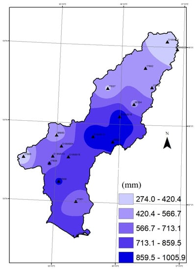 A particular meteorological station is used when the point-scale temporal analysis of drought is concerned. On the other hand, spatial analysis of drought is as important as its temporal analysis, as it could be common for one point in an area to suffer dry conditions, whilst surrounding points in the same area experience normal or even humid conditions. Thus, information related to not only one particular station but also to neighboring stations is needed in making decision for drought mitigation or preparedness at the basin scale. Spatial analysis is performed using data from all available meteorological stations in the basin. This provides spatial drought characterization that utilizes the severity, intensity, duration and return period. It can be presented in the form of spatial patterns of drought intensity contours for a given drought duration and return period. Spatial variability of drought events in the literature has been approached from different perspectives [21,22,23,30,31]. He et al. [32] investigated drought hazard and spatial characteristic analysis in China using a GIS-based drought hazard assessment model.