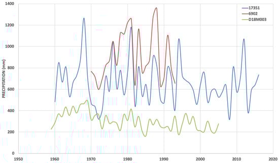 The average annual total precipitation is 641 mm in the Seyhan River basin; it changes from 274 mm in Kazancik (D18M011) in the north to 1006 mm in Hasan Cavuslar (D18M012) in the central part of the basin. A general decreasing tendency in the precipitation is observed from the coastal south to the north in the basin (Figure 3). As for the temporal change in the precipitation of the Seyhan River basin, three meteorological stations were taken: Adana (17351) from the southern, Feke (6902) from the central and Uzunpinar (D18M003) from the northern part (Figure 4). The annual total precipitation time series of the meteorological stations depict a visual stationarity along the observation period, meaning that no significant trend is observed. Also, a parallel tendency is noticed from the temporal fluctuations in the precipitation of the selected meteorological stations. This is simply connected to the size of the basin which is not so large as to create a difference.
