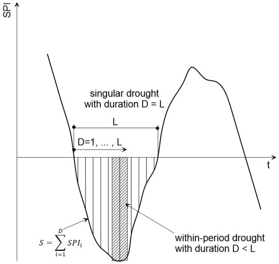 A drought is defined as a period in which the SPI is continuously negative [41,45,46]. In other words, it begins when the SPI first falls below zero and ends with a positive value of SPI [41]. Thus, the retrospective analysis of drought events by using runs of SPI values may be useful to derive tangible information for precipitation required to overcome the drought [19].