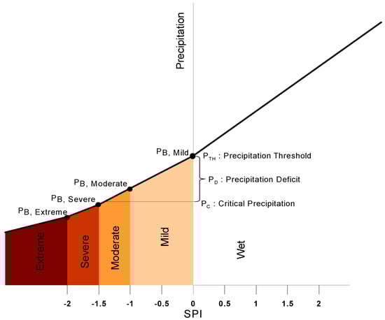 The regression equation can be used to calculate the precipitation threshold value. For time scales 1, 3, 6 and 9 months, the relation between precipitation and SPI changes from month to month. That is, a particular function should be used for each month of the year. However, one curve exists for time scales of 12 and 24 months. Drought is classified depending on the value that the drought index takes [47]. Referring to Figure 6, the precipitation threshold (PTH) was taken as precipitation at SPI = 0 for all time scales. Precipitation values at the boundary of drought classes (PB,Extreme, PB,Severe, PB,Moderate, PB,Mild) are determined based on the classification of McKee et al. [41] as shown in Figure 6. Also shown is the critical precipitation (Pc) which is expected to occur under a critical drought. The difference between the precipitation threshold and the critical precipitation is defined as the precipitation deficit and it is calculated by Equation (17)