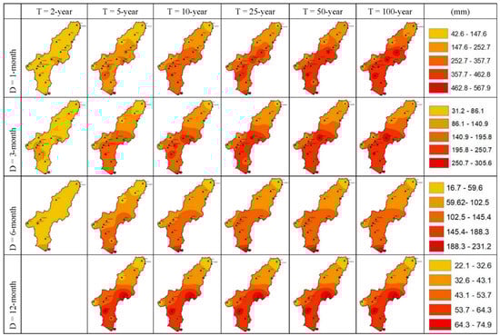 Spatial mapping becomes useful in obtaining information for stations with smaller size observation that prevents making a proper frequency analysis or no observation at all [40]. The resulting precipitation deficit corresponding to D month-drought duration and T year-return period at k = 12-month time scale was mapped using the inverse distance weighted (IDW) interpolation technique (Figure 8). Only the precipitation deficit calculated from the SPI was considered in the interpolation process to derive the spatial mapping of the drought over the basin.