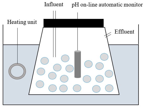 A schematic diagram of the experimental reactor used in this study is shown in Figure 1. Sequencing batch reactors made of plexiglass were used in this study. The whole device was wrapped with black cloth to occlude light, which can have a negative impact on bacteria [23,24]. The reactor was filled with the seed anammox sludge with the 1–3 mm (in length) granular activated carbon carriers, which were cultured in a 50 L reactor for 6 years at Guilin University of Technology, China, and showed high biological activity [25,26,27,28,29]. The working volume was 300 mL, and the experimental wastewater enters the reactor through a peristaltic pump. The effluent was drained from the upper area after passing through the sludge layer. The experiment was conducted at 32 ± 1 °C, controlled using a water bath. The influent pH was adjusted at 7.4~7.6 by adding 0.5 mol/L H2SO4 [30]. The dissolved oxygen (DO) concentrations of the feeding synthetic wastewater were kept below 0.5 mg/L using N2 gas purging for approximately 1 h [31].