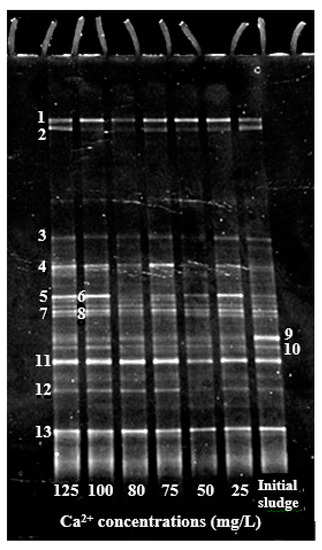 Figure 3 shows the DGGE electropherogram, which is capable of separating organisms at the genus level, where the bright and dark bands represent the dominant and inferior microbial taxa, respectively. From the changes in bright and dark bands among the reaction conditions, dominant and inferior taxa varied by Ca2+ concentration. Moreover, some bright bands were only observed at a single Ca2+ concentration. For example, band 1 was bright at all Ca2+ concentrations, indicating that it was a dominant species. Band 3 was also present at all Ca2+ concentrations, but exhibited a lower brightness, indicating that it was an inferior taxon. Band 9 was only bright (i.e., dominant) in the initial sludge, and showed low brightness at all Ca2+ concentrations. Compared to the microbial population of the initial sludge, addition of, and changes in, Ca2+ concentration resulted in substantial changes in microbial population structure.