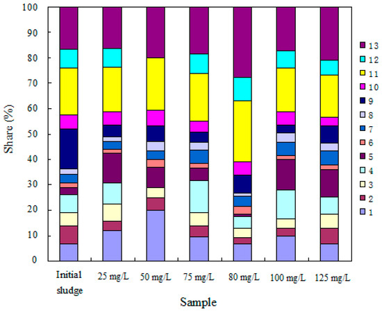 The relative proportions of the dominant taxa in the seven samples are shown in Figure 4. The microbial community structures differed substantially between the initial sludge and sludge containing added Ca2+, as well as among the samples containing different Ca2+ concentrations.