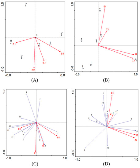 Correlations between microbial community structure of the anammox sludge with (A) environmental factors and (B) nitrogen removal rate and between microbial community structure based on the denaturing gradient gel electrophoresis bands with (C) environmental factors and (D) nitrogen removal rate. The black numbers in (A, B) refer to the experimental reactors: 1, (Ca2+) = 25 mg/L; 2, (Ca2+) = 50 mg/L; 3, (Ca2+) = 75 mg/L; 4, (Ca2+) = 80 mg/L; 5, (Ca2+) = 100 mg/L; 6, (Ca2+) = 125 mg/L; 7, initial sludge. The black numbers in (C, D) refer to the band numbers in Figure 3. E1, Ca2+ concentration; E2, total nitrogen content; E3, NH4+–N content; E4, NO2−–N content; X1, NO2−–N removal rate; X2, NH4+–N removal rate; X3, TN rate.