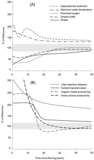 Hypothetical trajectory of (A) physical variables and (B) functional variables in a small (<5 m wide) pastoral stream following fencing to exclude livestock from channels and riparian zones, adapted from Parkyn et al. [49]. Similar trajectories are predicted for larger streams but the time to recover to approximately 100% of reference condition (shaded area) will take longer. Note: ecosystem respiration is not plotted because despite decreasing over time values are not predicted to reach within 300% of reference condition within 50 years.