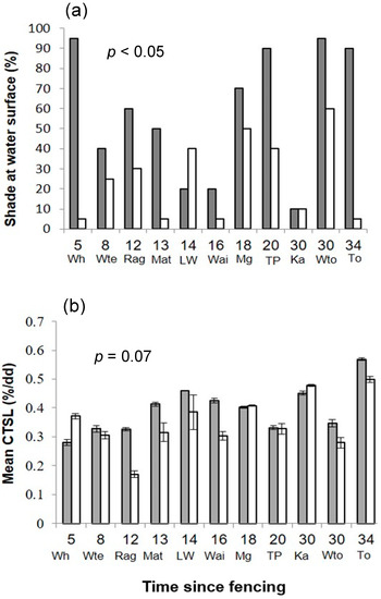 The differences in physical stream habitat were not as prominent as expected between fenced and unfenced sites. However, fenced sites had significantly wider vegetated riparian zones and higher levels of stream shading than their paired unfenced sites. Shade estimates were significantly higher for fenced (mean = 58.1%) than unfenced (mean = 25%) stream reaches (T(10) = 3.30, p < 0.05; Figure 2a; Table 2). Whatawhata and Waitomo fenced sites had the highest shading (95%; Figure 2) and the Kakahu fenced site the least shading within fenced sites (10%; Figure 2a). There was no difference in canopy height between the two treatments (T(10) = 1.34; p = 0.21) and the level of shading did not depend on time since fencing (Table 3).