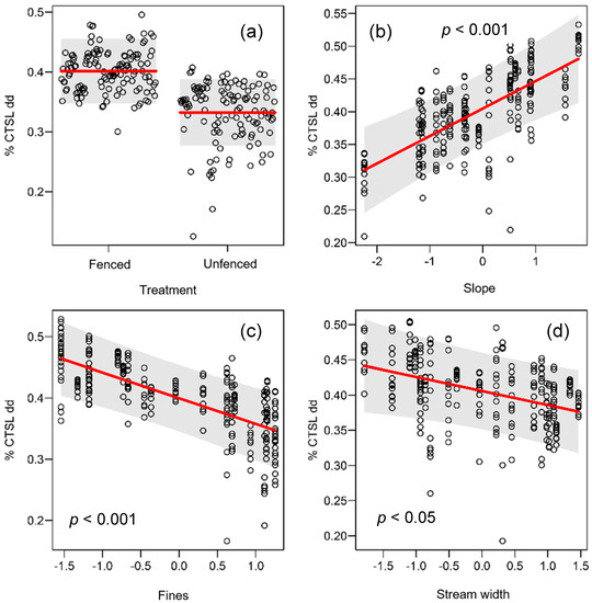 Our results suggest that CTSL is also likely to increase as the streambed gets steeper and decrease as streams get wider, though it is not clear to us how these relationships relate to stream fencing. Parkyn et al. [79] demonstrated how stream widening can occur following the establishment of riparian buffers in similar agricultural streams. However, bed gradient is driven by catchment-scale rather than reach-scale processes. We did not conduct any longitudinal analysis, specifically testing for the overriding effect of the catchment on our findings. A clear avenue for future restoration studies is to view functional responses in the context of catchment-scale drivers.