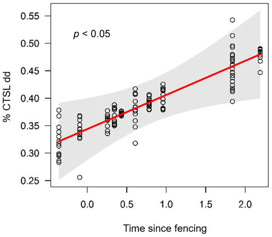 The effect of time since fencing on % cotton tensile strength loss (CTSL) per degree day (dd) fitted using a linear mixed model within fenced sites.