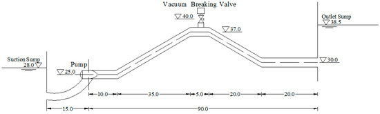 As shown in Figure 4, the water supply system is mainly composed of the following components: Suction sump, outlet sump, pump, siphon pipe and vacuum breaker valve. Meanwhile, the parameters of the water supply system are listed in Table 1. From the table, we can see that the water levels of the suction sump and outlet sump are 28 m and 38.5 m, respectively. The siphon has a horizontal length of 105 m and a diameter of 2.4 m. The vacuum break valve is placed at the top of the siphon, with a −3-m intake pressure and 0.3-m diameter. Separately, the vacuum breaker valve is numerically simulated according to the air valve model as well as the vacuum breaker valve model.