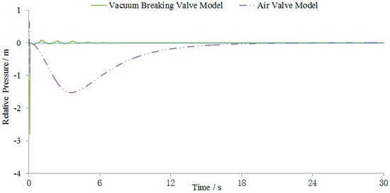 The different relative pressure changes in the air in the pipe are shown in Figure 5. After a water pumping accident occurs, the vacuum at the top of the siphon pipe reaches the set limit, the vacuum breaker valve opens, and the gas pressure in the valve quickly rises to atmospheric pressure. When the air valve model is used to numerically simulate the vacuum breaker valve, the negative pressure wave is quickly transmitted to the vacuum breaker valve at the valve opening time, causing the relative pressure of the gas to drop rapidly to −1 m at t = 0.1 s, while at t = 3.6 s, it is reduced to −2.5 m again, then slowly rises, the gas pressure tends to 0 m, and then remains unchanged. As the water level in the vacuum breaker valve is unchangeable according to the air valve model, the water level is higher than it should be, leading to a smaller relative pressure. Therefore, the relative pressure of the gas first decreases and then gradually rises to zero. When the vacuum breaker valve model is used for the simulation calculation, the relative pressure is suddenly reduced to −2.8 m at the valve opening time due to the negative pressure wave action, and then quickly rises to 0 m, and when t ≥ 5 s, the gas pressure remains unchanged at 0 m. Since the water level in the vacuum breaker valve is variable according to the vacuum breaker valve model, the relative pressure of the gas in the valve after the vacuum breaker valve is opened is approximately maintained at atmospheric pressure.