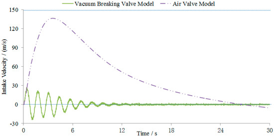According to Equations (1)–(4), different processes of the air pressure lead to different processes of the intake velocity change, as shown in Figure 6. When the air valve model is used to simulate the intake velocity of the vacuum breaker valve, the intake velocity gradually increases from 0, reaching a maximum value of 136.9 m/s at t = 3.6 s, and then gradually decreases. At t = 26.86 s, the intake velocity is less than 0, and the vacuum breaker valve begins to vent. As the water level is unchangeable, the calculated water level is always greater than the actual water level during the intake process; therefore, the gas pressure in the valve is too small, and the intake air velocity is continuously increased to a larger number before slowly being reduced until gas is discharged. The intake and exhaust period of the vacuum breaker valve is long. When the vacuum break valve model is used to simulate the intake velocity of the valve, the gas periodically enters and exits the vacuum break valve with the water hammer pressure fluctuation. The maximum intake and exhaust rates are small; the maximum intake rate does not exceed 22.5 m/s, the minimum value is not lower than −22.5 m/s, and the period is short.