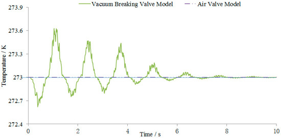 According to Equation (28), different air pressure change processes lead to different temperature change processes, as shown in Figure 7. When the air valve model is used to numerically simulate the gas temperature in the vacuum breaker valve, the thermodynamic change in the gas in the valve obeys the ideal gas isothermal process, and the ambient temperature is maintained regardless of the temperature change of the valve gas. Thus, the valve gas temperature is kept constant at 273 K. When the vacuum breaker valve model is used for simulation, the gas temperature in the valve changes periodically with the gas pressure. The maximum temperature is 273.63 K and the minimum is 272.61 K, which is a small change. For this project, since the gas pressure fluctuation is not large, the change in the calculated temperature is also small, and thus, the influence of temperature is negligible. The above analysis shows that the calculation results are reasonable and consistent with common sense.