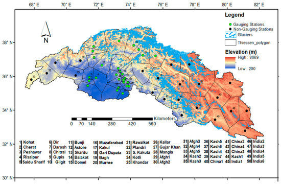 The daily precipitation data from 28 gauging stations for the period of 1961–2015 were collected from the Pakistan Meteorological Department (PMD) and Water and Power Development Authority (WAPDA). The elevations of these stations vary from 283 m at the Mangla gauging station to 2317 m at the Skardu gauging station. These stations cover most of the key area of the SRIR, which lies within the boundaries of Pakistan. These precipitation gauging stations cover a north–south range of approximately 100 km from the Gupis to Astore gauging stations and an east–west range of approximately 200 km from the Skardu to Gupis gauging stations []. The missing data accounted for less than 0.001% of the data, and these missing data were approximated by developing simple linear correlations with nearby stations. As the SRIR is a transboundary basin shared by Afghanistan, Pakistan, China and India, the PMD and WAPDA are Pakistani organizations that have installed precipitation gauging stations only within the boundaries of Pakistan. Due to the unavailability of precipitation data from Afghanistan, China and India in their respective parts of the SRIR, Asian Precipitation-Highly Resolved Observational Data Integration Towards Evaluation of Water Resources (APHRODITE) precipitation data from 22 non-gauging stations were used in this study. These non-gauging stations were named according to the name of the country in which they are located. The distribution and elevation of the gauging and non-gauging stations are shown in Figure 1.