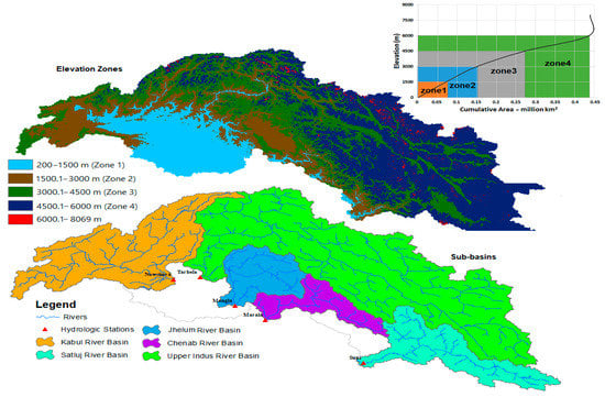 According to different studies on glaciers in the Western Himalayas, glacial mass balances are decreasing and glacier snouts are retreating []. The glaciated area of the Kabul River basin decreased by 40% from 1962–2002 []. A large number of glaciers in the north and west of Karakoram are decreasing, while some glaciers in the central part of Karakoram are showing an increase in mass balance [,]. The elevation in the study area, which was derived from a 90 m resolution digital elevation model (DEM) from the Shuttle Radar Topography Mission (SRTM) project governed by the US National Aeronautics and Space Administration (NASA), varies from 200 to 8069 m above sea level (Figure 1). The study area was divided into four elevation zones with an altitudinal difference of 1500 m between two successive zones for the zone-wise analysis of precipitation (Figure 2). Zone 4 has the highest area, while zone 1 has the lowest area. The SRIR is the main source of fresh water for agricultural, industrial and domestic use in Pakistan. The total catchment area of this source region is approximately 439,784 km2, and it plays a vibrant part in the development of the country.