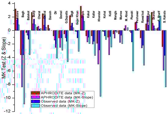Comparison of Mann-Kendall (MK)-Z and slope of average monthly observed and APHRODITE precipitation data.