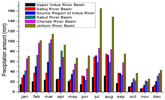 The SRIR has very distinctive climatic conditions, and the precipitation in this area exhibits great spatial and temporal variations. The distribution of precipitation during different months of a year in the study area and its main sub-basins from 1961 to 2015 are shown in Figure 4. The highest amount of precipitation in the study area (72.8 mm) was received in August, while the lowest amount of precipitation (13.4 mm) was received in November. According to a study conducted by Amin [] in the northern areas of Pakistan which is part of the SRIR, about 21% of observed rainfall occurred in the month of March while about 37% of the observed rainfall occurred in the month of July and was almost the same in August.