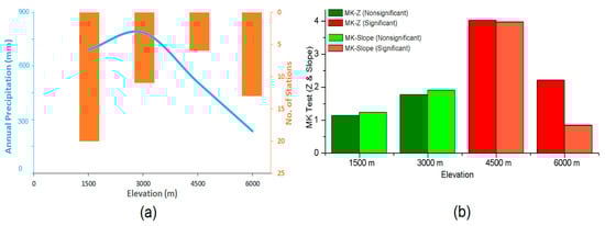 The annual precipitation and number of stations at different elevations are shown in Figure 6a, while the trends and slope of the annual precipitation calculated using the MK test are presented in Figure 6b. Elevation zone 2 (1500–3000 m) has the highest value, while zone 4 (4500–6000 m) has the lowest value of annual precipitation. Most of zone 2 lies in the Western Himalayas, which provide a barrier against monsoon depressions and receives a large amount of precipitation, while zone 4 lies in the TP, which is a high-altitude arid grassland with an annual precipitation of only 100–300 mm. Annual precipitation exhibits increasing trends in all altitudinal zones, with significant increases in zone 3 and zone 4 with magnitudes of 4 mm/year and 0.84 mm/year, respectively, because of climate change. Yan and Liu [] reported a significant increase in temperature over the TP at an elevation of 4000 m.