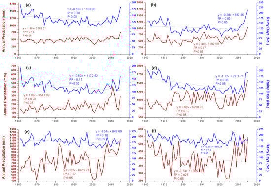 Time series of annual precipitation and rainy days (a) Source region of the Indus River, (b) Kabul sub-basin, (c) Upper Indus sub-basin, (d) Jhelum sub-basin, (e) Chenab sub-basin, (f) Satluj sub-basin.