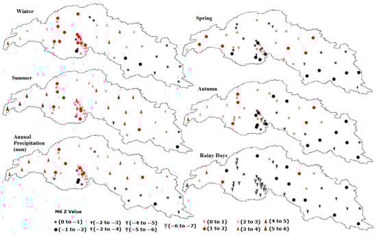 Seasonal precipitation in the study area was calculated by taking into account the standard months of each season. The four seasons in this region were defined as December to February for winter, March to May for spring, June to September for summer and October to November for autumn. The trends in seasonal precipitation, annual precipitation and rainy days that were calculated using the MK test in the study area are presented in Figure 8. During the winter, 35 out of the 50 stations showed increasing trends in precipitation with significantly increasing trends (α = 5%) at 18 stations. Decreasing trends were observed at 15 stations with one station (India 5) showing a significant decrease. Significantly increasing trends were observed at 27 stations during the summer. The significantly increasing trends in precipitation at 54% of the stations during the summer and 36% of the stations during the winter will increase the chances of flooding in the Indus Basin. The eastern part of the study area mostly exhibited decreasing trends, while increasing trends in precipitation were observed during the winter, spring, summer, and autumn in the western part.
