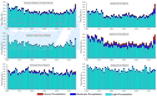 The distributions of wet or rainy days for light, moderate, and heavy precipitation in the study area and its main sub-basins are shown in Figure 9. The average number of rainy days for light, moderate, and heavy precipitation are 121, 9 and 4, respectively. In the study area, the Jhelum River basin has the highest number of rainy days for heavy and moderate precipitation, i.e., 10 and 21, respectively, while the UIRB has the lowest number of rainy days for heavy (1 day) and moderate (3 days) precipitation.