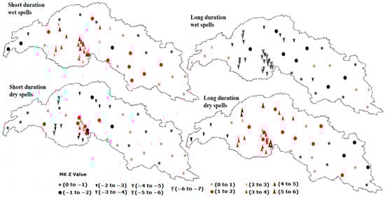 Trend analysis of short- and long-duration wet and dry spells in the study area.