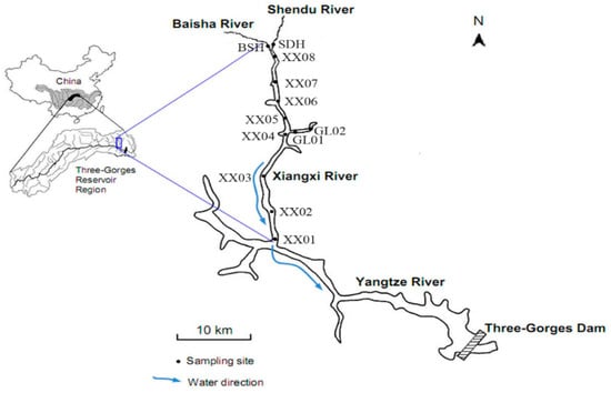 Twelve sample zones were set along the Xiangxi River (Figure 1). Sample stations XX01~XX08 were located in the main channel from the estuary to the upstream region (Figure 1). There was one sample site in each of the two tributaries, the Baisha River (Site BSH), and the Shendu River (Site SDH). Two sample zones, GL01 and GL02, were set in Gaolan Bay. Water samples were not collected in XX08 in summer because of the usage of cascade hydropower stations. These sample zones were classified into the lacustrine zone (XX01~XX08 and GL01, GL02) and the riverine zone (BSH and SDH). They were selected to represent a wide range of environmental gradients under the influence of the Three Gorges Dam.