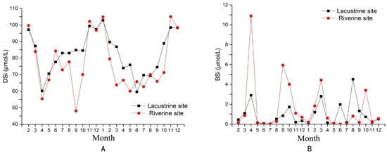 Monthly DSi (A) and BSi (B) variation (mean value, n = 21 for lacustrine site, n = 6 for riverine site in each month) from February 2015 to December 2016. Spring: March ~ May; Summer: June ~ August; Autumn: September ~ November; Winter: December ~ February.