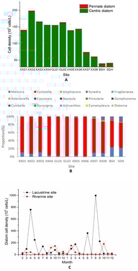 The diatom cell density (A) and proportion of pennate diatom cell density (B) at different sites. Monthly diatom cell density from February 2015 to December 2016 (C).