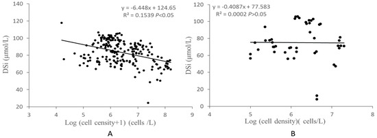 Relationships between diatom cell density and DSi in the lacustrine zone (A) and riverine zone (B).