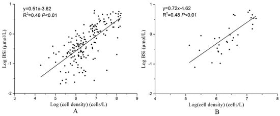 Relationships between diatom cell density and BSi in the lacustrine zone (A) and riverine zone (B).