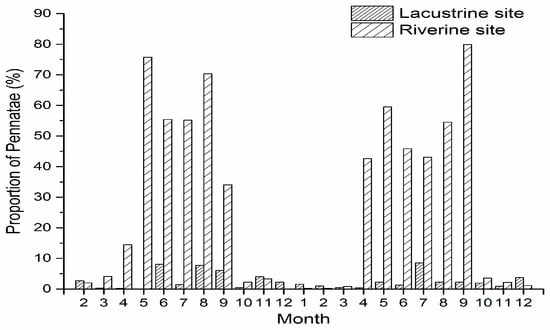 Monthly variation of pennate diatoms in the lacustrine zone and the riverine zone.