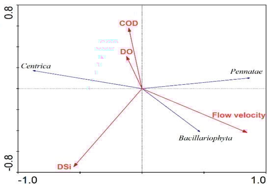 In Figure 8, environmental variables were standardised by normalisation, and diatom species samples were centered. A forward-selected RDA of the diatom species data set revealed water velocity (F = 52.34, P = 0.002), DSi (F = 20.15, P = 0.002), COD (F = 3.85, P = 0.044), and DO (F = 10.62, P = 0.002) as the minimum set of significant environmental variables that could describe the greatest variation in the data set; a total 77.3% of the variation in taxonomic compositions was explained. Pennate diatoms showed a significant positive correlation with water velocity, while centric diatoms were negatively correlated with water velocity (P < 0.05). A negative correlation between pennate diatoms and DSi was observed, but this relationship was not evident between centric diatoms and DSi.