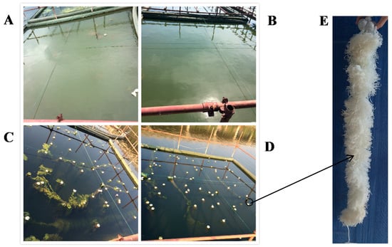 Experimental setup of the enclosures and structure of the (E) artificial aquatic plant (AAP); (A,B) control enclosures; (C,D) treated enclosures with 1 strand AAP /m3 with length of 80–85 cm.