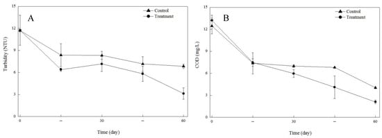 During the experiment, water temperature ranged between 13.1 °C and 15.6 °C. In control enclosures, turbidity decreased from 11.40 (±1.70) nephelometric turbidity units (NTU, Figure 3A) to 6.85 (±0.30) NTU by day 60. In treatment (i.e., within AAPs) enclosures, turbidity decreased from 10.80 (±2.04) NTU to 3.13 (±0.77) NTU by day 60. Water turbidity in control enclosures was significantly higher (p < 0.05) than that of treatment enclosures within the AAPs throughout the experiment after 60 days of operation. The concentration of COD (Figure 3B) declined from 12.06 (±1.35) mg/L to 4.04 (±0.037) mg/L and to 2.11 (±0.25) mg/L in the control and treatment enclosures, respectively; there was no significant difference between the enclosures (p > 0.05). Total nitrogen (Figure 3C) declined from 0.96 to 0.41 mg/L in treatment enclosures over 60 days, while TN slowly decreased from 0.96 to 0.90 mg/L in the first month and then gradually increased to 0.94 mg/L in the control enclosures. Jiang et al. measured total nitrogen removal of 92% by using a hybrid biofilm reactor []. Total phosphorous (Figure 3D) decreased from 0.067 (±0.002) mg/L to 0.051 mg/L and to 0.033 mg/L in the control and treatment enclosures, respectively. Water TP in control enclosures was significantly higher (p < 0.05) than that of treatment enclosures within the AAPs after 60 days of operation; the removal efficiency later exceeded 50%. Sukačová et al. reported a P removal efficiency of 99% within 24 hours of P addition when using an algal biofilm []. Chlorophyll a was used as an indicator of algal biomass (Figure 3E). In control enclosures, Chl a slightly declined from 285.46 (±22.66) to 177.65 (±2.42) µg/L by day 60, while the Chl a of treatment enclosures decreased from 283.17 (±36.01) µg/L to 43.82(±6.34) µg/L by day 60, which was significantly lower than that of control (p < 0.05) enclosures after 30 days of operation; the removal efficiency exceeded 80%.The results suggest the feasibility of using AAPs to reduce nutrient concentrations and algal biomass in eutrophic waters. The biophysical adsorption of phytoplankton by the microfibers and its adherent periphyton biofilms may contribute to the uptake, storage, and transformation of nutrients, as well as other chemicals, which play a key role in the self-purification of water bodies [].