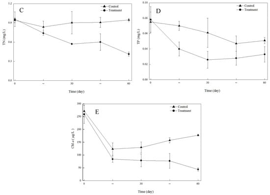 (A) turbidity, (B) chemical oxygen demand (COD), (C) total nitrogen (TN), (D) total phosphorous (TP) and (E) chlorophyll a (Chl a) content in the water column over 60 days. Error bars represent the standard deviation (n = 3 × 2).