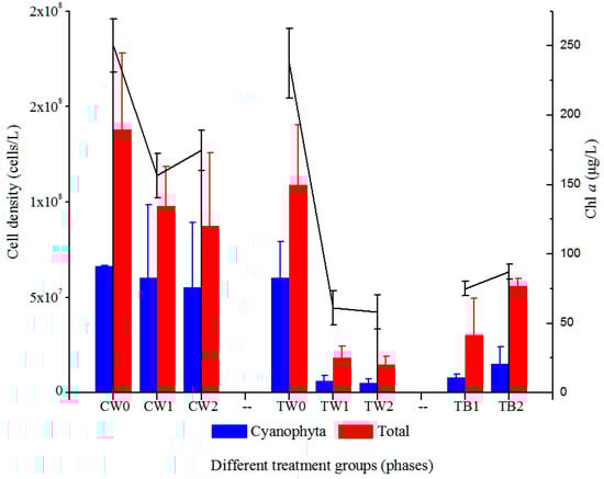 Variation of cell density relative to total algae (including cyanobacteria), and the corresponding concentration of Chl a (shown as black line) in all enclosures. Error bars represent standard deviation (n = 3 × 2). Designations 0, 1, and 2 represent days 0, 30, and 60, respectively.