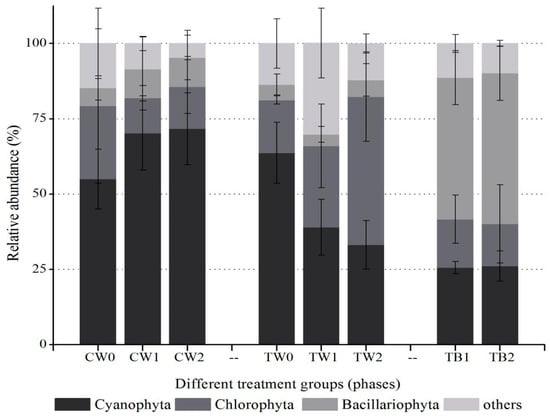 The structural composition of phylum-level algae was exhibited through the relative abundances (Figure 5). With the extension of experimental time, the proportion of cyanobacteria that consistently dominated and occupied more than 50% of the habitat reached 71.7% in the CW. In the TW, the dominant phylum was Cyanophyta at the initial stage and then shifted to Chlorophyta. Specifically, the proportion of Cyanophyta declined rapidly from 63.7% to 33.2%; simultaneously, the ratios of the Chlorophyta increased gradually from 17.5% to 49.2%. These trends may have been caused by the removal of nutrients, which agrees with the previous finding from Tlili et al. [] that micropollutants from wastewater discharge were responsible for changes in community structure. An interesting result is that the ratios of Bacillariophyta in the periphyton biofilms that attached to the artificial aquatic plants (TB) accounted for a mean of 48.5%, and the dominant species were Achnanthes exigua, Gomphonema acuminatum, Cymbella pusilla, Navicula placentula, and Navicula graciloides. The success of diatoms implies that they have highly efficient and adaptable survival mechanisms and growth strategies. Previous studies have found that diatoms were generally regarded as the principal constituent of the primary colonizers in biofilms [,].