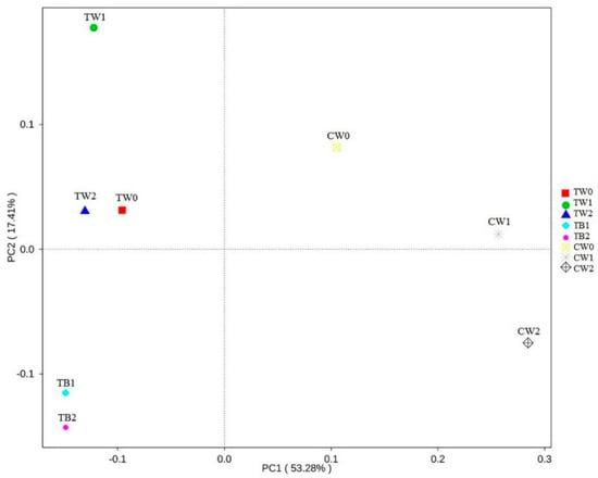 In this study, PCoA (Figure 6) revealed that PC 1 and PC 2 explained 53.28% and 17.41% of the variation in the bacterial community, respectively. Importantly, TWs were clustered together and were effectively separated from the (CW) samples along PC 1, which was influenced by the decreased concentration of the nutrients of TW adsorbed by the periphyton biofilms attached to the AAPs. Carr et al. [] reported that bacteria and algae in biofilms coexist in an association that offers space and resources to sustain production of both groups of organisms. Additionally, the heterotrophic bacterial community is an important component of periphyton biofilms and contributes to biodegrade pollutants, the changes in the microbial structure and function in periphyton biofilms exposed to different nutrient supplies []. For instance, Suberkropp et al. [] reported a shift in the microbial structure by the continuous nutrient enrichment of a forested headwater stream. Moreover, TW and TB samples were slightly separated along PC2. This may indicate that the microbial communities of the periphyton biofilms preferred specific adaptable and functional microbes, although TB and TW shared the same source of microbial consortia. Therefore, to clarify the changes in the microbial structure in different samples, we considered and analyzed the diversity of the microbial community.