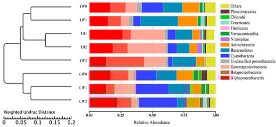 The results indicate that the bacterial diversity and population richness of TW samples increased gradually, and this is revealed by the Shannon index and Simpson index. The microbial population richness of the TW sample was higher than that of the CW sample after the intervention of the AAPs. Meanwhile, it was indicated that bacterial diversity and population richness of sample TB were quite high and increased gradually as revealed by the Shannon (from 0 up 8.38) and Simpson (from 0 to 0.98) indices (Table 1). The results showed in Figure 7 illustrate the relative abundance of the 10 most abundant bacteria at the phylum level in the CW, TW, and TB samples.