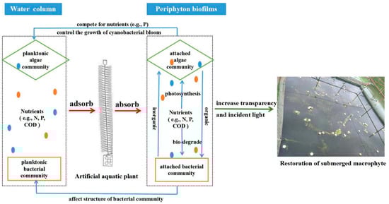 Given the above, a schematic of mechanisms for improving water quality in shallow eutrophic waters by using AAPs is shown in Figure 8. When an AAP with a large specific surface area was introduced into the eutrophic lake water, large amounts of nutrients (e.g., N, P, and COD), phytoplankton, and planktonic bacteria in the water column were rapidly adsorbed in thousands of microfibers in the AAP to form the periphyton biofilm. Nutrients could then be gradually assimilated by adherent microalgae, and then biodegraded by attached bacteria with the amplification of periphyton biofilms. Thus, the reduced availability of nutrients and the competition between the planktonic and attached microbial community led to the restraint of cyanobacterial growth and the subsequent change in planktonic and attached microbial communities. Ultimately, the decrease of nutrients and cyanobacterial biomass in the water column increase the transparency and incident light, thereby facilitating the growth of submerged macrophytes.