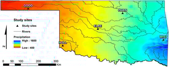 Normal annual precipitation in Oklahoma (1981–2010). Source: PRISM raster map. The locations of study sites and major rivers are also demonstrated.