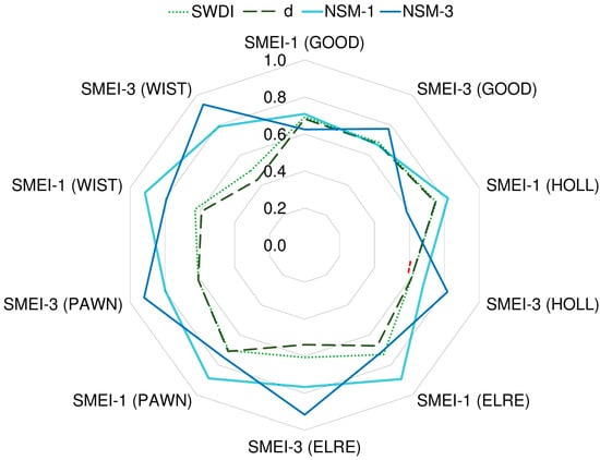The correlations between meteorological and existing SM drought indices found in this study were similar to those reported in previous studies. For example, the range of SWDI-AWD correlation coefficients was 0.42–0.58 in the present study. Martínez-Fernández et al. [11] found weak to moderate correlations (0.40–0.57) between weekly SWDI and AWD in a semi-arid region with heterogeneous soils. Mishra et al. [62] reported a correlation coefficient of 0.56 for the same indices under humid subtropical climate. In addition, moderate to high correlation coefficients (0.60–0.80) were reported for NSM-PDSI by Dutra et al. [16] for a Mediterranean region, and this study found similar r values ranging between 0.47 and 0.74.