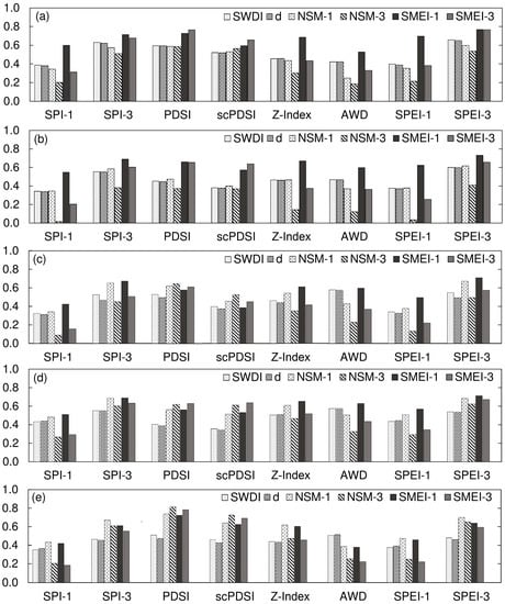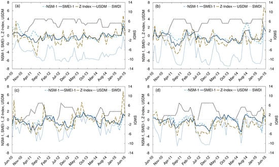 Due to the occurrence of multiple droughts of varying magnitudes between 2010 and 2015, this period was selected to further evaluate the performance of newly developed SMEI in tracking temporal variations in drought. Changes in SMEI-1 during the selected period were compared against fluctuations in USDM, two SM drought indices, and one meteorological drought index. The two SM indices were NSM-1 and SWDI. The d index was excluded from the comparison because it had the smallest average r (Figure 4). The single meteorological index used in comparison was the Z-Index, since it incorporates the soil–water balance in its calculations. The USDM timeline was included for comparison with the overall drought conditions. It should be noted that USDM estimates are based on a combination of meteorological drought indices, field observations, and stakeholder feedback [8].